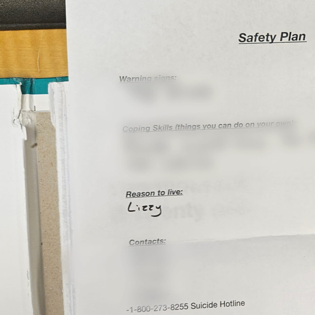 Stuffed in the pages of this journal was a “Safety Plan.” What is a safety plan, you ask? A safety plan is a worksheet you fill out, that you review and sign-off on with your therapist/psychiatrist/etc., when you’re in a place where you may feel the world and those you love would be better off without you.
